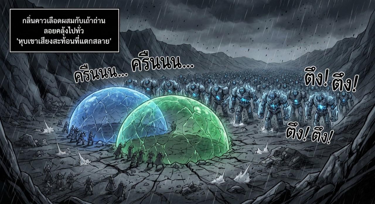 กลิ่นคาวเลือดผสมกับกลิ่นไหม้ของเถ้าถ่านลอยคลุ้งไปทั่ว "หุบเขาเสียงสะท้อนที่แตกสลาย" (Valley of Broken Echoes) ท้องฟ้าสีหม่นถูกปกคลุมด้วยเมฆครึ้ม ฝนที่ตกลงมาไม่ใช่หยาดน้ำ แต่เป็นเศษเถ้าธุลีที่เกิดจากการปะทะกันของพลังเวทมนตร์มหาศาล เบื้องหน้าคือมอนสเตอร์ศิลาเยือกแข็ง (Frost-Iron Golems) นับพันตัวที่กำลังเคลื่อนทัพเข้ามากดดันแนวป้องกันของกองทัพหลวงแห่งสภาเวทมนตร์